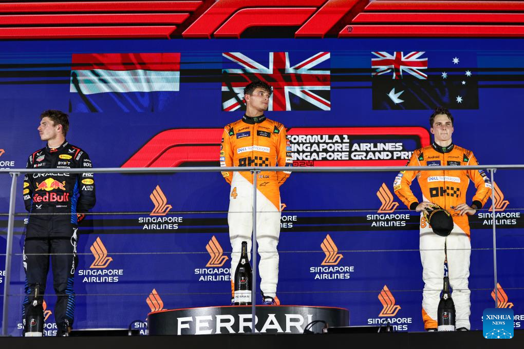 First placed McLaren's British driver Lando Norris (C), second placed Red Bull's Dutch driver Max Verstappen (L) and third placed McLaren's Australian driver Oscar Piastri attend the awarding ceremony for the Formula 1 Singapore Grand Prix night race at Marina Bay Street Circuit, Singapore, Sept. 22, 2024. (Photo by Qian Jun/Xinhua)