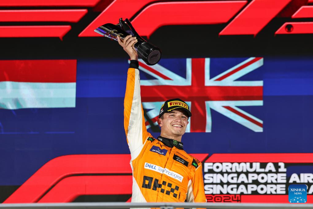 First placed McLaren's British driver Lando Norris celebrates during the awarding ceremony for the Formula 1 Singapore Grand Prix night race at Marina Bay Street Circuit, Singapore, Sept. 22, 2024. (Photo by Qian Jun/Xinhua)