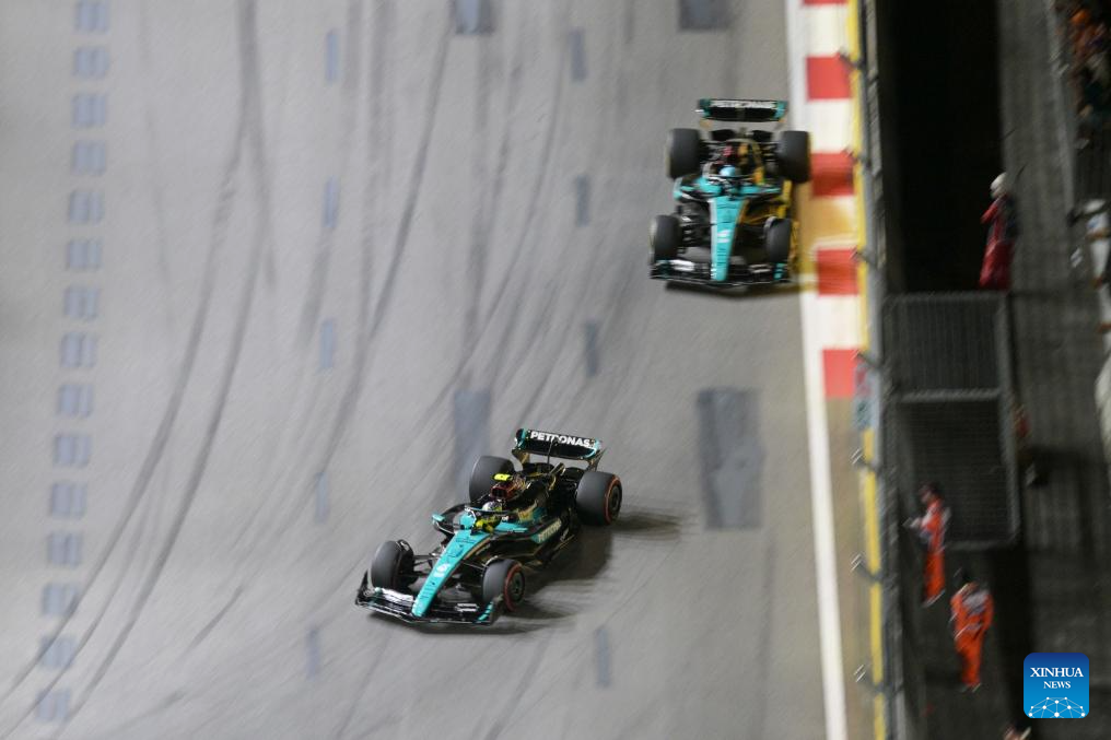 Mercedes driver Lewis Hamilton (bottom) of Britain and his teammate George Russell of Britain compete during the Formula 1 Singapore Grand Prix night race at Marina Bay Street Circuit, Singapore, Sept. 22, 2024. (Photo by Then Chih Wey/Xinhua)