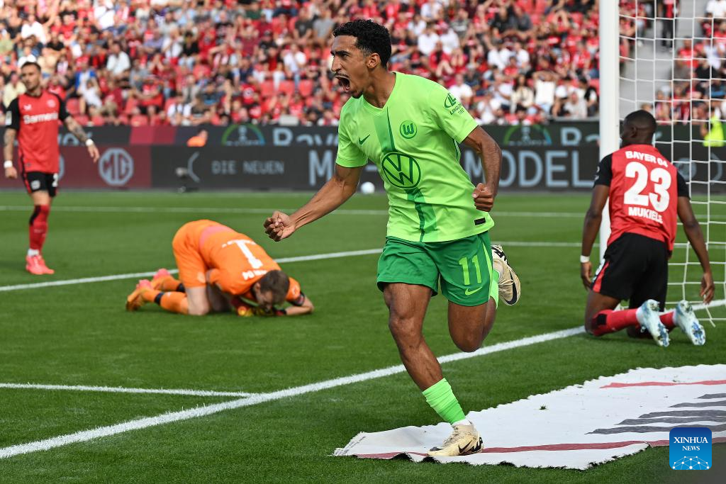 Tiago Tomas of VfL Wolfsburg celebrates scoring during the first division of Bundesliga match between Bayer 04 Leverkusen and VfL Wolfsburg in Leverkusen, Germany, Sept. 22, 2024. (Photo by Ulrich Hufnagel/Xinhua)