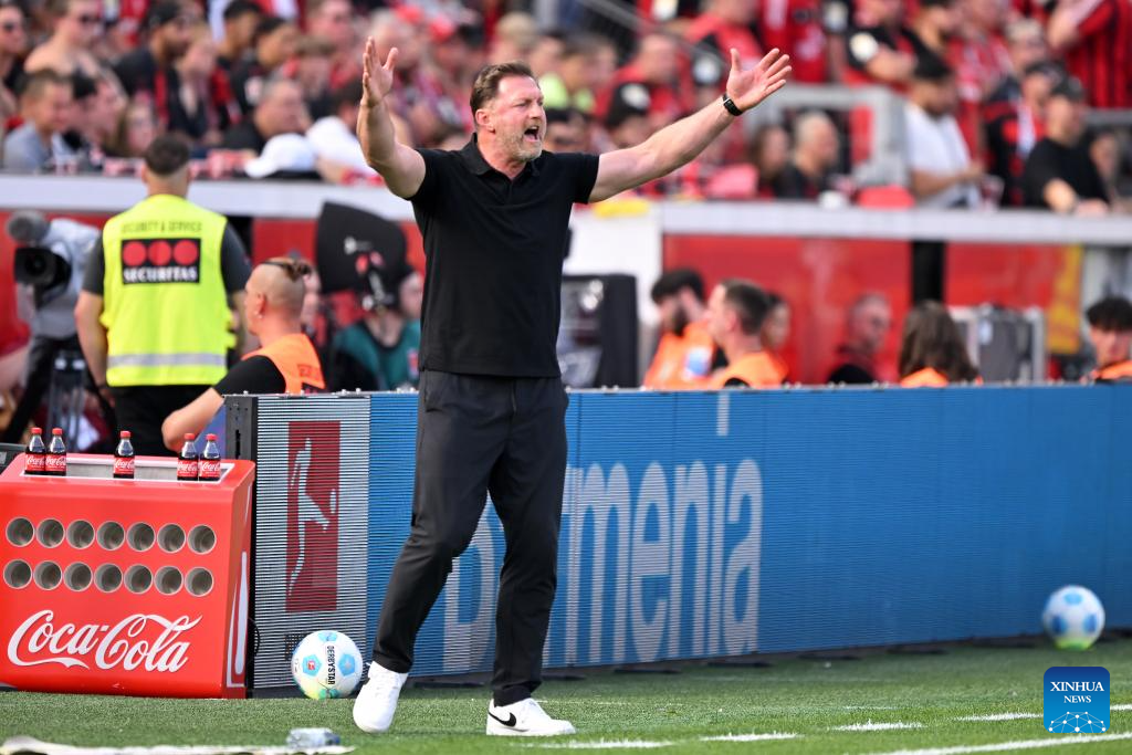 Ralph Hasenhuettl, head coach of VfL Wolfsburg, instructs during the first division of Bundesliga match between Bayer 04 Leverkusen and VfL Wolfsburg in Leverkusen, Germany, Sept. 22, 2024. (Photo by Ulrich Hufnagel/Xinhua)