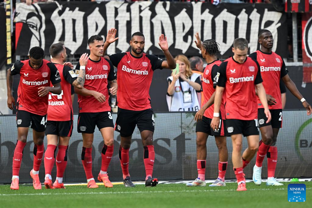 Jonathan Tah (4th L) of Bayer 04 Leverkusen celebrates scoring with teammates during the first division of Bundesliga match between Bayer 04 Leverkusen and VfL Wolfsburg in Leverkusen, Germany, Sept. 22, 2024. (Photo by Ulrich Hufnagel/Xinhua)