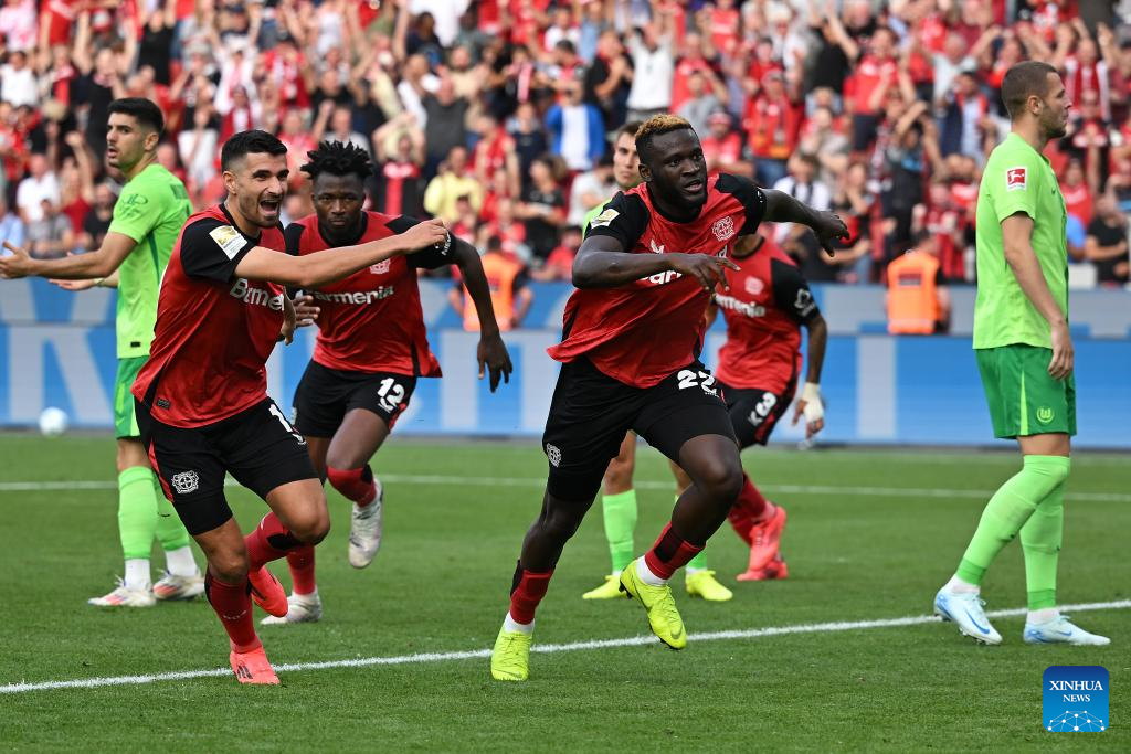 Victor Boniface (front C) of Bayer 04 Leverkusen celebrates scoring during the first division of Bundesliga match between Bayer 04 Leverkusen and VfL Wolfsburg in Leverkusen, Germany, Sept. 22, 2024. (Photo by Ulrich Hufnagel/Xinhua)