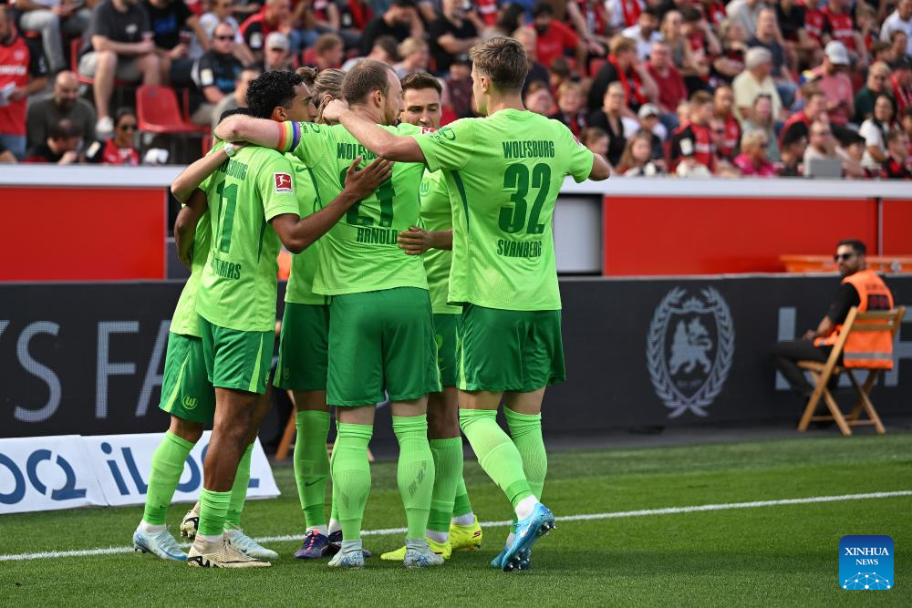 Tiago Tomas (1st L)of VfL Wolfsburg celebrates scoring with teammates during the first division of Bundesliga match between Bayer 04 Leverkusen and VfL Wolfsburg in Leverkusen, Germany, Sept. 22, 2024. (Photo by Ulrich Hufnagel/Xinhua)