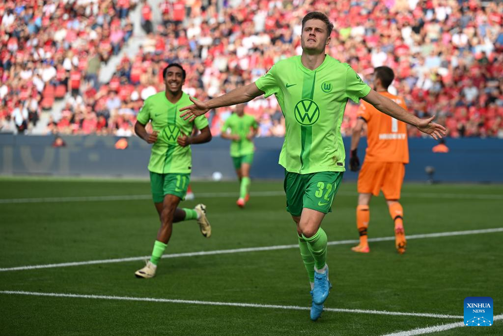 Mattias Svanberg (front) of VfL Wolfsburg celebrates scoring during the first division of Bundesliga match between Bayer 04 Leverkusen and VfL Wolfsburg in Leverkusen, Germany, Sept. 22, 2024. (Photo by Ulrich Hufnagel/Xinhua)