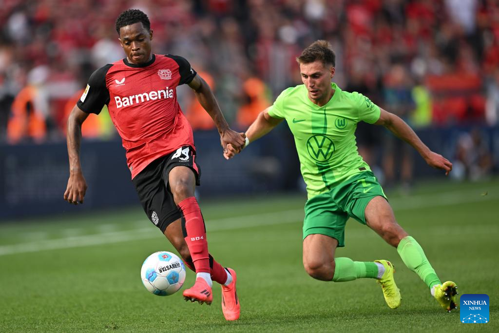 Jeremie Frimpong (L) of Bayer 04 Leverkusen vies with Jakub Kaminski of VfL Wolfsburg during the first division of Bundesliga match between Bayer 04 Leverkusen and VfL Wolfsburg in Leverkusen, Germany, Sept. 22, 2024. (Photo by Ulrich Hufnagel/Xinhua)