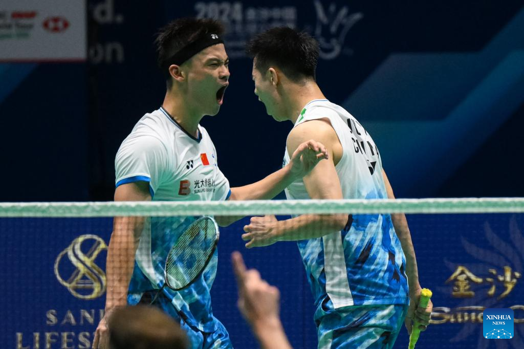 Chen Xujun (L)/Liu Yi of China celebrate scoring during the men's doubles first round match against Ben Lane/Sean Vendy of England at Macao Open Badminton 2024 in Macao, south China, Sept. 24, 2024. (Xinhua/Cheong Kam Ka)