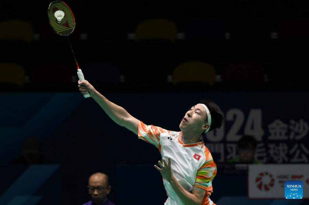 Chan Yin Chak of China's Hongkong hits a return during the men's singles qualification first round match between Liu Liang of China and Chan Yin Chak of China's Hongkong at Macao Open Badminton 2024 in Macao, south China, Sept. 24, 2024. (Xinhua/Cheong Kam Ka)
