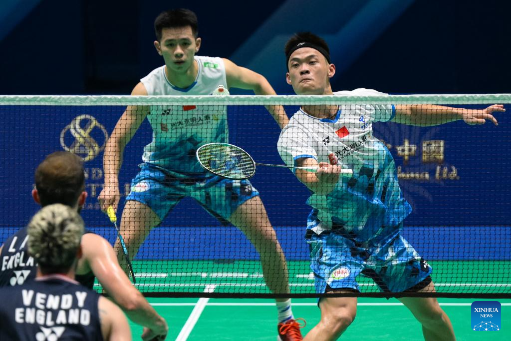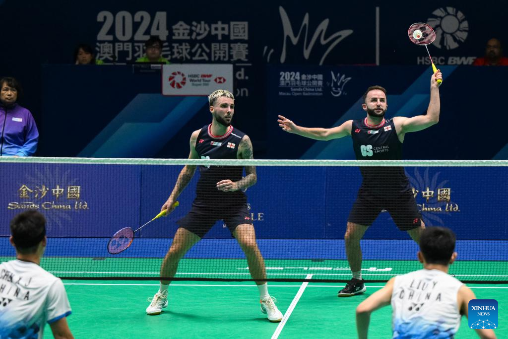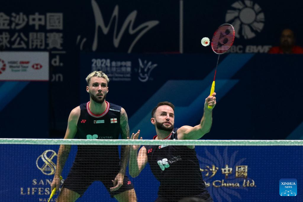 Ben Lane (R)/Sean Vendy of England compete during the men's doubles first round match between Chen Xujun/Liu Yi of China and Ben Lane/Sean Vendy of England at Macao Open Badminton 2024 in Macao, south China, Sept. 24, 2024. (Xinhua/Cheong Kam Ka)