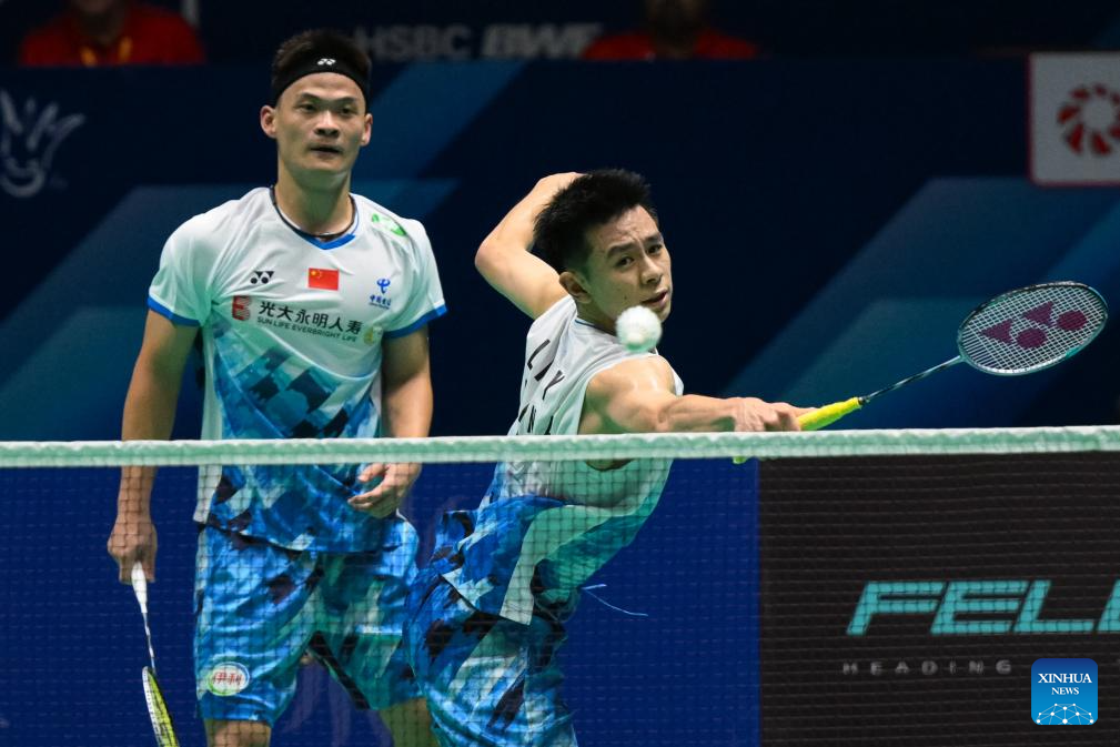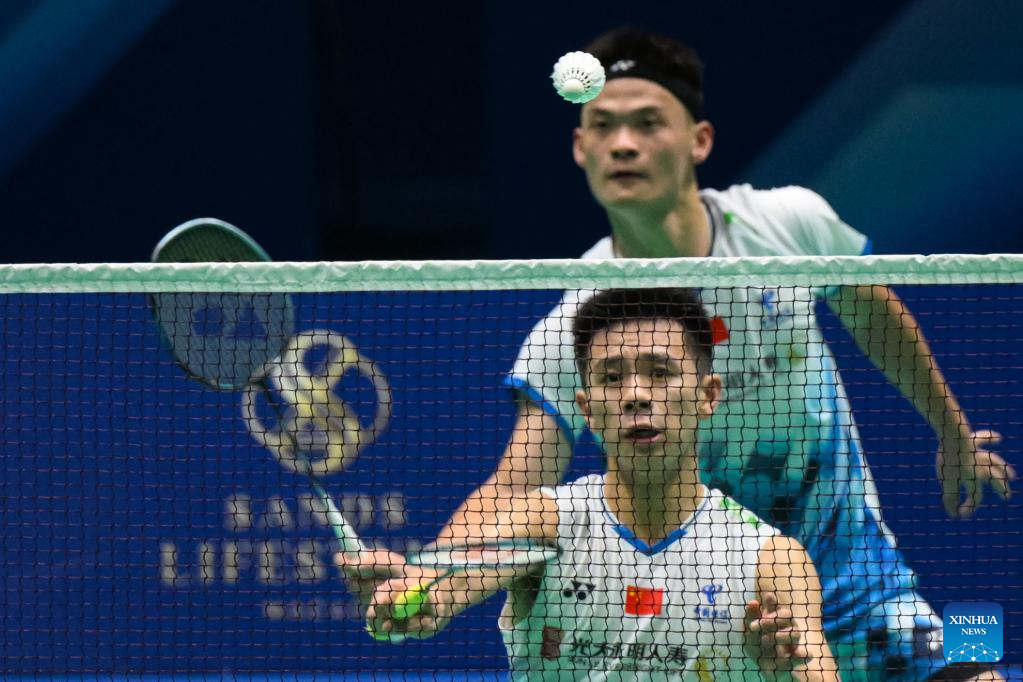 Chen Xujun/Liu Yi (R) of China compete during the men's doubles first round match against Ben Lane/Sean Vendy of England at Macao Open Badminton 2024 in Macao, south China, Sept. 24, 2024. (Xinhua/Cheong Kam Ka)