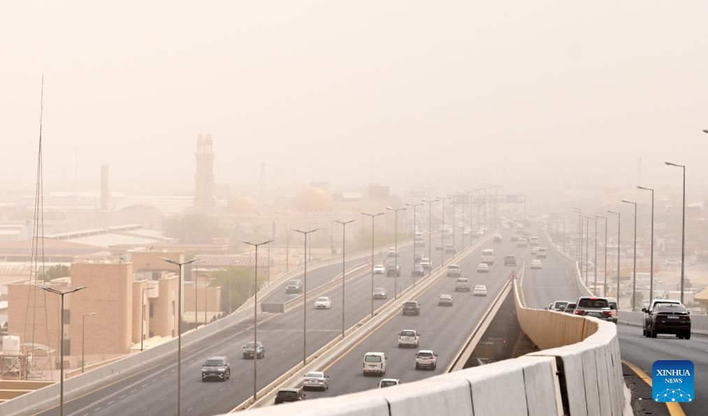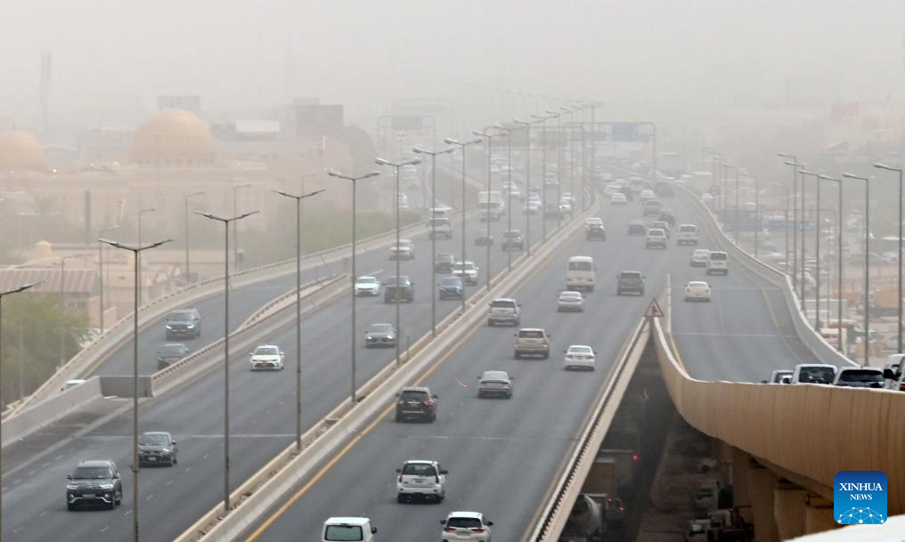 (240926) -- FARWANIYA GOVERNORATE, Sept. 26, 2024 (Xinhua) -- Cars drive on a road during a strong dust storm in Farwaniya Governorate, Kuwait on Sept. 26, 2024. (Photo by Asad/Xinhua)
