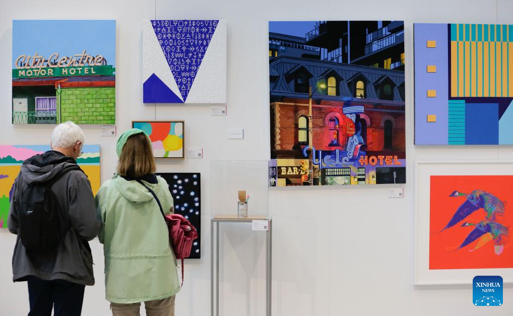 Visitors view artworks on display at the 2024 Splash Art Auction Preview Exhibition Tour in Vancouver, British Columbia, Canada, Sept. 25, 2024. More than 90 artists from across Canada took part in the 2024 Splash Art Auction event, donating their works for the public auction. (Photo by Liang Sen/Xinhua)