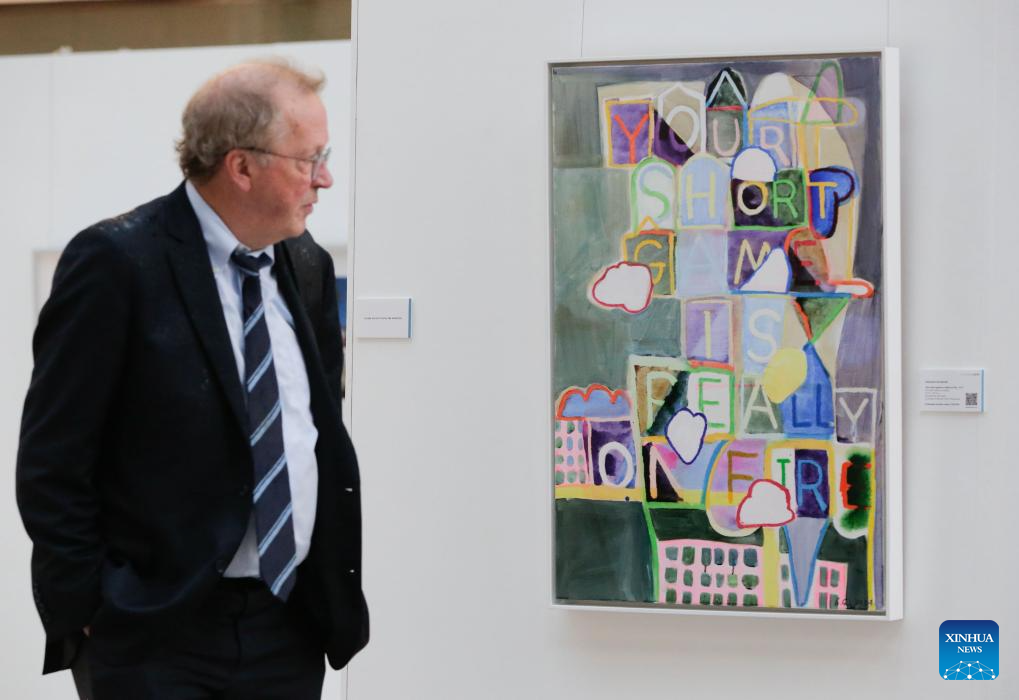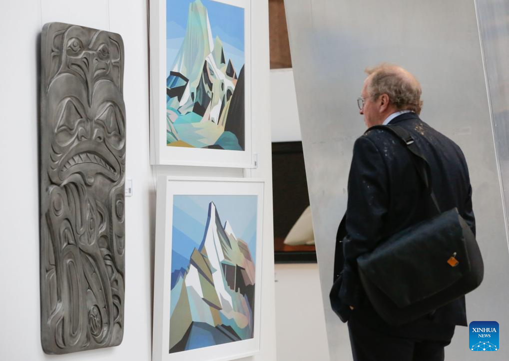 A visitor views artworks on display at the 2024 Splash Art Auction Preview Exhibition Tour in Vancouver, British Columbia, Canada, Sept. 25, 2024. More than 90 artists from across Canada took part in the 2024 Splash Art Auction event, donating their works for the public auction. (Photo by Liang Sen/Xinhua)