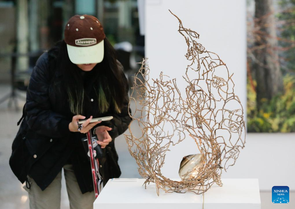 A visitor views an artwork on display at the 2024 Splash Art Auction Preview Exhibition Tour in Vancouver, British Columbia, Canada, Sept. 25, 2024. More than 90 artists from across Canada took part in the 2024 Splash Art Auction event, donating their works for the public auction. (Photo by Liang Sen/Xinhua)