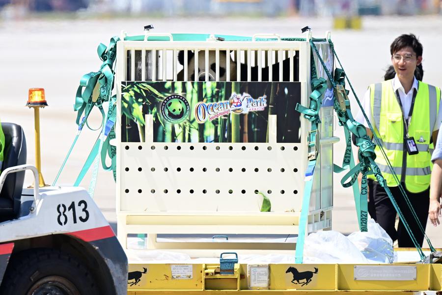 HONG KONG, Sept. 27 (Xinhua) -- A pair of giant pandas gifted by the central government to the Hong Kong Special Administrative Region (HKSAR) of China arrived here Thursday, sparking celebrations among panda lovers.