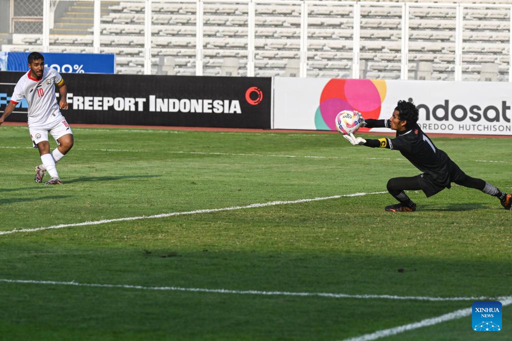 Goalkeeper Mohamed Yaameen (R) of Maldives makes a save during the AFC U20 Asian Cup 2025 Qualifiers match between Maldives and Yemen in Madya Stadium, Jakarta, Indonesia, Sept. 27, 2024. (Xinhua/Agung Kuncahya B.)