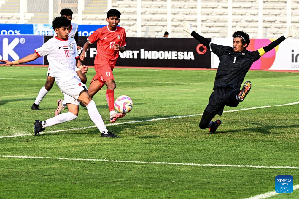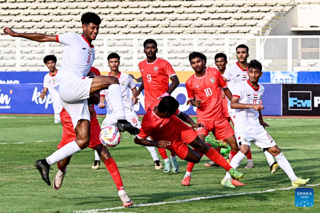 Abdulaziz Awadh Masnom (front L) of Yemen shoots the ball during the AFC U20 Asian Cup 2025 Qualifiers match between Maldives and Yemen in Madya Stadium, Jakarta, Indonesia, Sept. 27, 2024. (Xinhua/Agung Kuncahya B.)