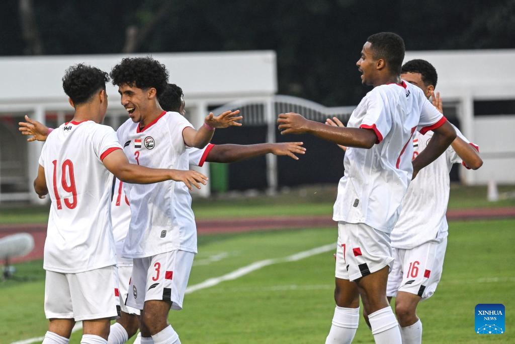 Players of Yemen team celebrate scoring during the AFC U20 Asian Cup 2025 Qualifiers match between Maldives and Yemen in Madya Stadium, Jakarta, Indonesia, Sept. 27, 2024. (Xinhua/Agung Kuncahya B.)