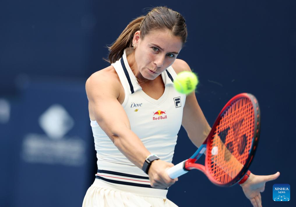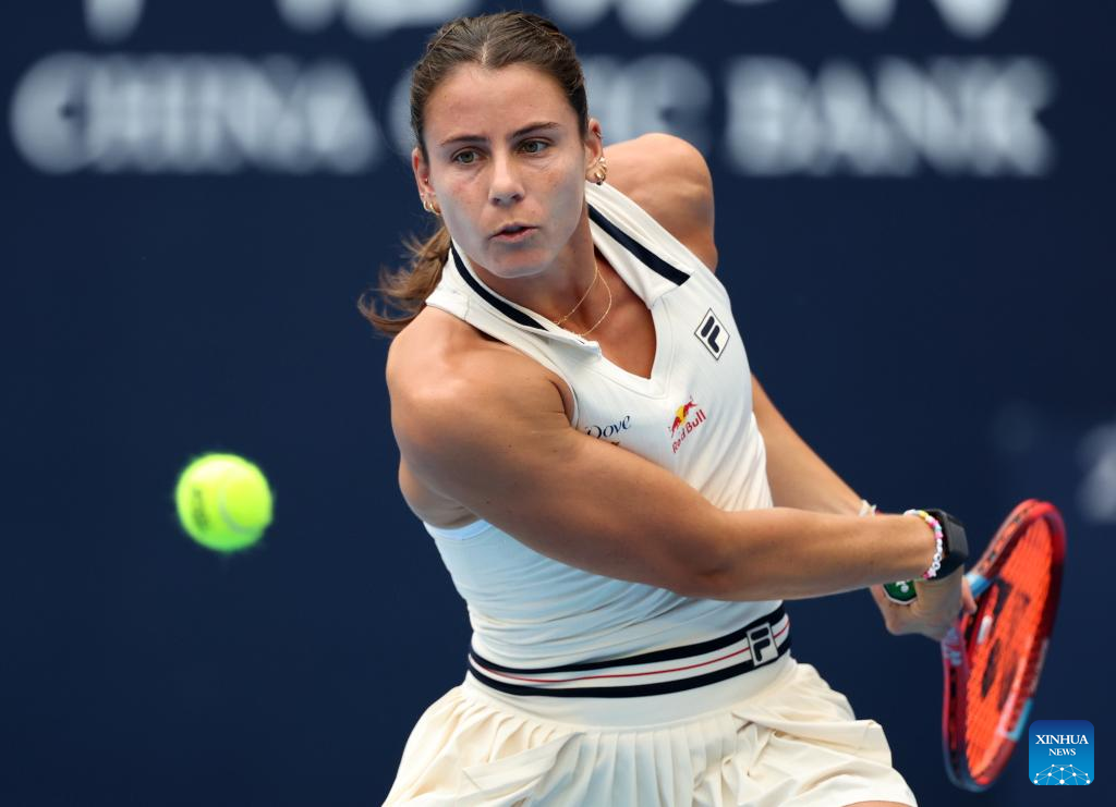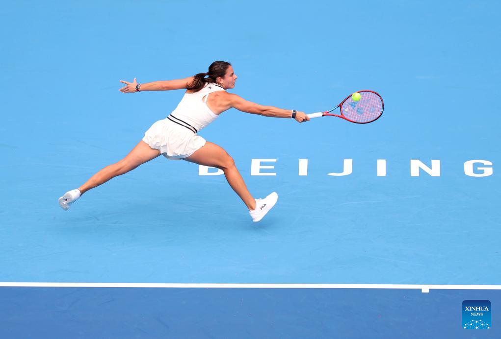 Emma Navarro of the United States hits a return during the women's singles second round match against Zhang Shuai of China at 2024 China Open tennis tournament in Beijing, capital of China, Sept. 27, 2024. (Xinhua/Zhang Chenlin)