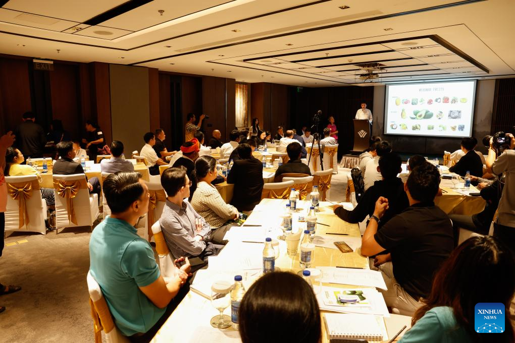 Participants attend the Lancang-Mekong Fruit Procurement Festival in Yangon, Myanmar, Sept. 26, 2024. The Lancang-Mekong Fruit Procurement Festival was held in Yangon, Myanmar, on Thursday. A total of 26 Chinese companies in the fields of agriculture, logistics and cross-border e-commerce, were in Yangon to negotiate fruit trade with representatives of 14 Myanmar companies and business associations. (Xinhua/Myo Kyaw Soe)