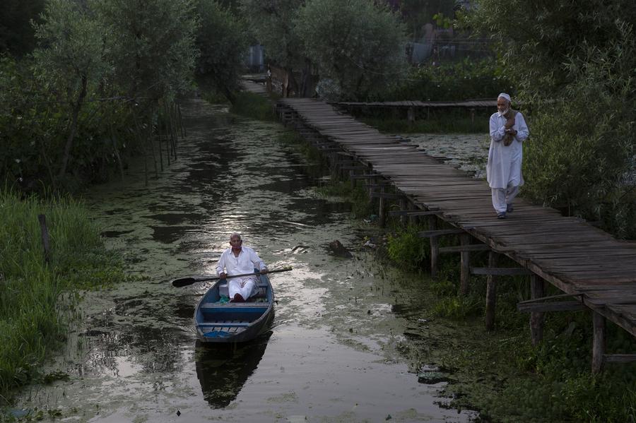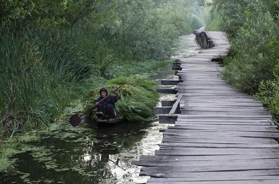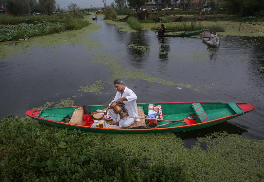 NEW DELHI, Sept. 28 (Xinhua) -- Walking along the shores of Dal Lake in Srinagar, the summer capital of Indian-controlled Kashmir, you can see small boats weaving in and out of the dense water plants.