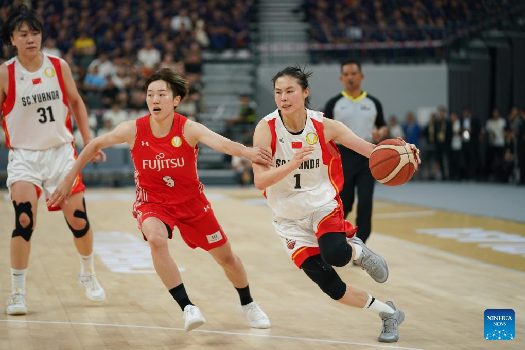 Akagi Riho (C) of Fujitsu Red Wave vies with Wang Siyu of Sichuan Yuanda Meile Basketball Club during the match between Sichuan Yuanda Meile Basketball Club and Fujitsu Red Wave at the FIBA Women's Basketball League Asia in Chengdu, southwest China's Sichuan Province, Sept. 28, 2024. (Xinhua/Xu Bingjie)