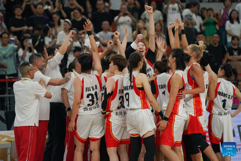 Members of Sichuan Yuanda Meile Basketball Club celebrate after the match between Sichuan Yuanda Meile Basketball Club and Fujitsu Red Wave at the FIBA Women's Basketball League Asia in Chengdu, southwest China's Sichuan Province, Sept. 28, 2024. (Xinhua/Xu Bingjie)