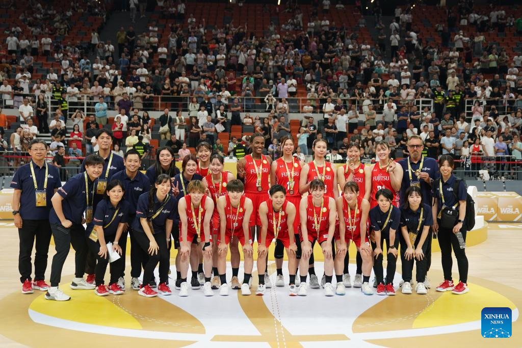 Team Fujitsu Red Wave celebrate winning the third place during the awarding ceremony at the FIBA Women's Basketball League Asia in Chengdu, southwest China's Sichuan Province, Sept. 28, 2024. (Xinhua/Xu Bingjie)