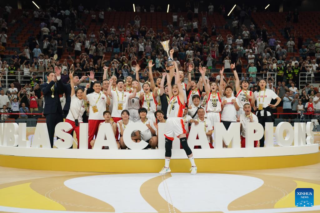 Sichuan Yuanda Meile Basketball Club celebrate winning champion during the awarding ceremony after the match between Sichuan Yuanda Meile Basketball Club and Fujitsu Red Wave at the FIBA Women's Basketball League Asia in Chengdu, southwest China's Sichuan Province, Sept. 28, 2024. (Xinhua/Xu Bingjie)