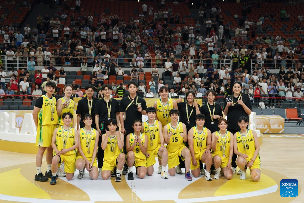 Team Cathy Life celebrate winning the second place during the awarding ceremony at the FIBA Women's Basketball League Asia in Chengdu, southwest China's Sichuan Province, Sept. 28, 2024. (Xinhua/Xu Bingjie)