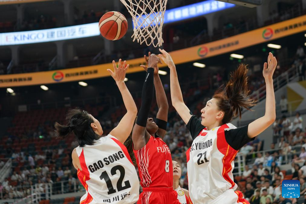 Mfon Obong Temitope Joshua (C) of Fujitsu Red Wave vies against Gao Song (L) and Han Xu of Sichuan Yuanda Meile Basketball Club during the match between Sichuan Yuanda Meile Basketball Club and Fujitsu Red Wave at the FIBA Women's Basketball League Asia in Chengdu, southwest China's Sichuan Province, Sept. 28, 2024. (Xinhua/Xu Bingjie)