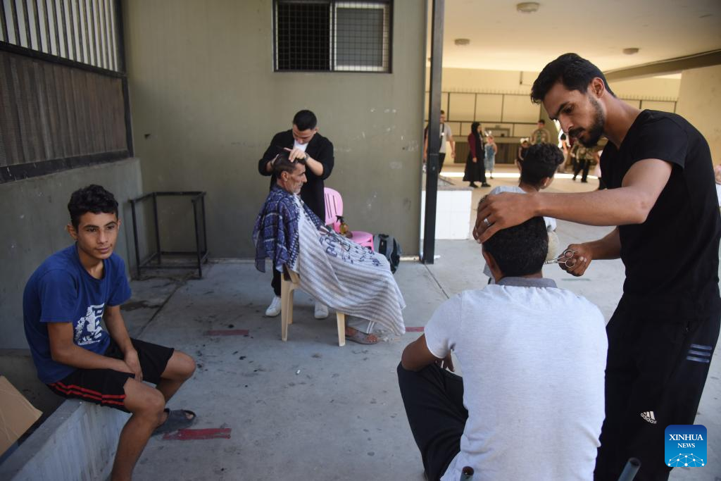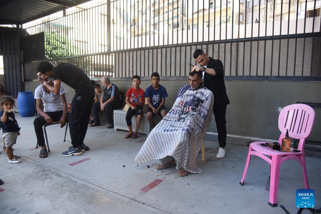 Displaced people from southern Lebanon have their hair cut at a local charity inside a school shelter in Tripoli, Lebanon, Sept. 29, 2024. (Photo by Khaled Habashiti/Xinhua)