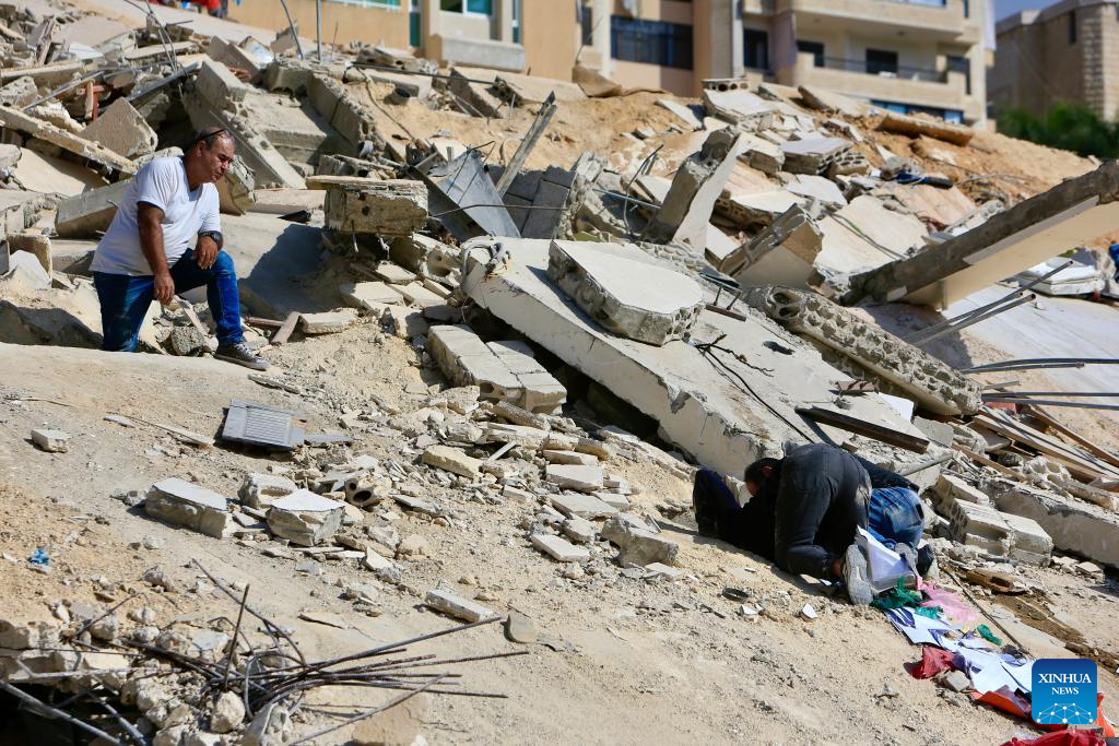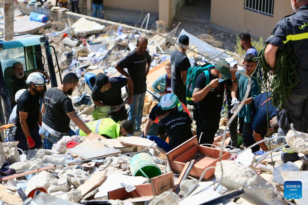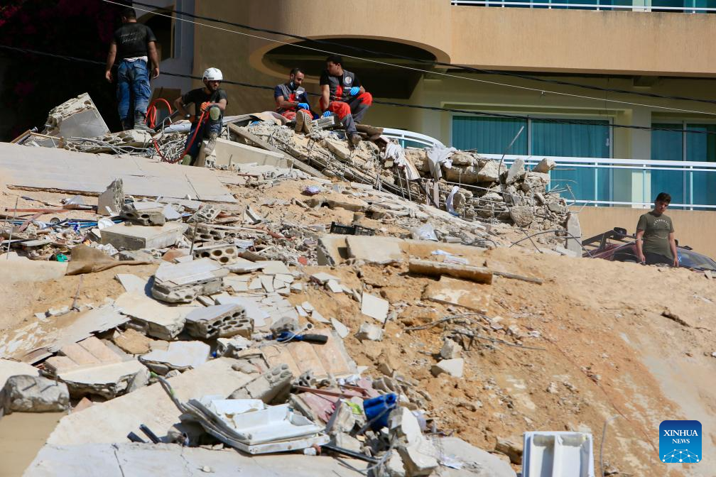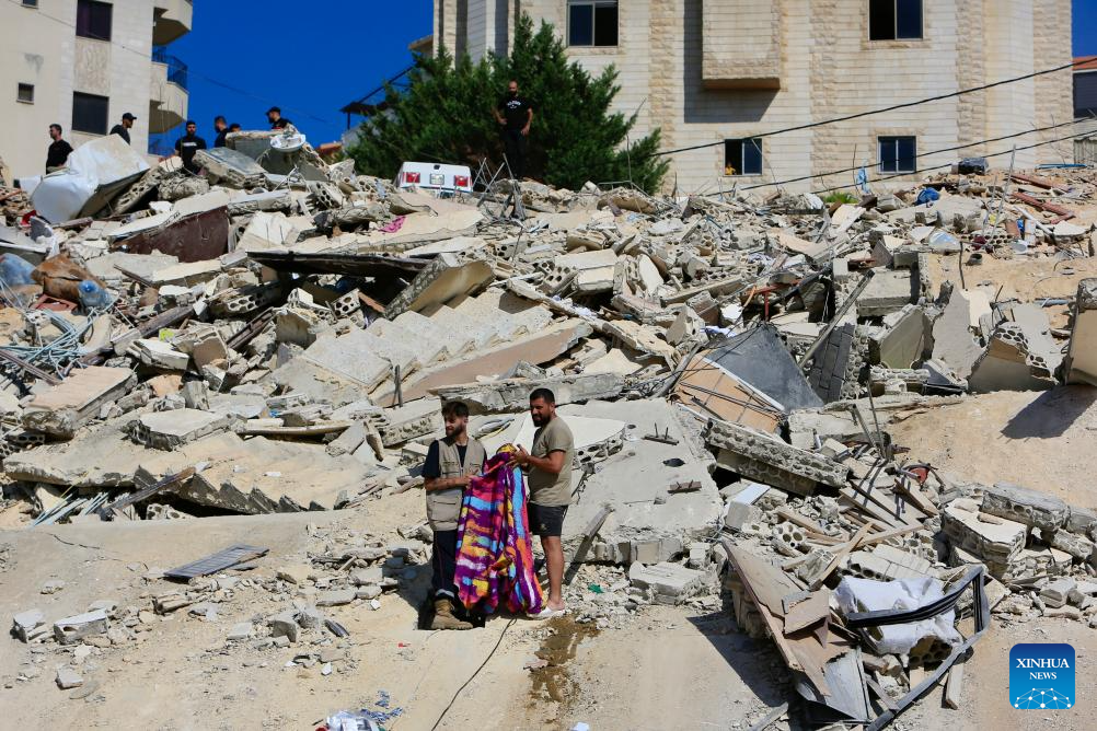 People conduct rescue work at a site of Israeli attacks in Ain Ed Delb, Lebanon, on Sept. 30, 2024. On Monday, the Lebanese Health Ministry's Public Health Emergency Operations Center updated that Israel's attacks on Ain Ed Delb, east of southern Lebanon, on Sunday resulted in 45 deaths and 70 injuries, while attacks on Hermel, in eastern Lebanon, on Sunday night killed 12 and injured 20. (Photo by Ali Hashisho/Xinhua)