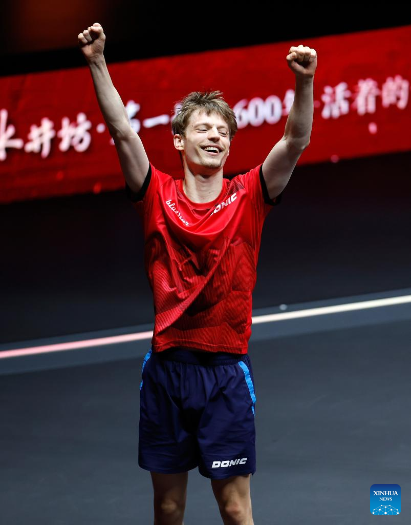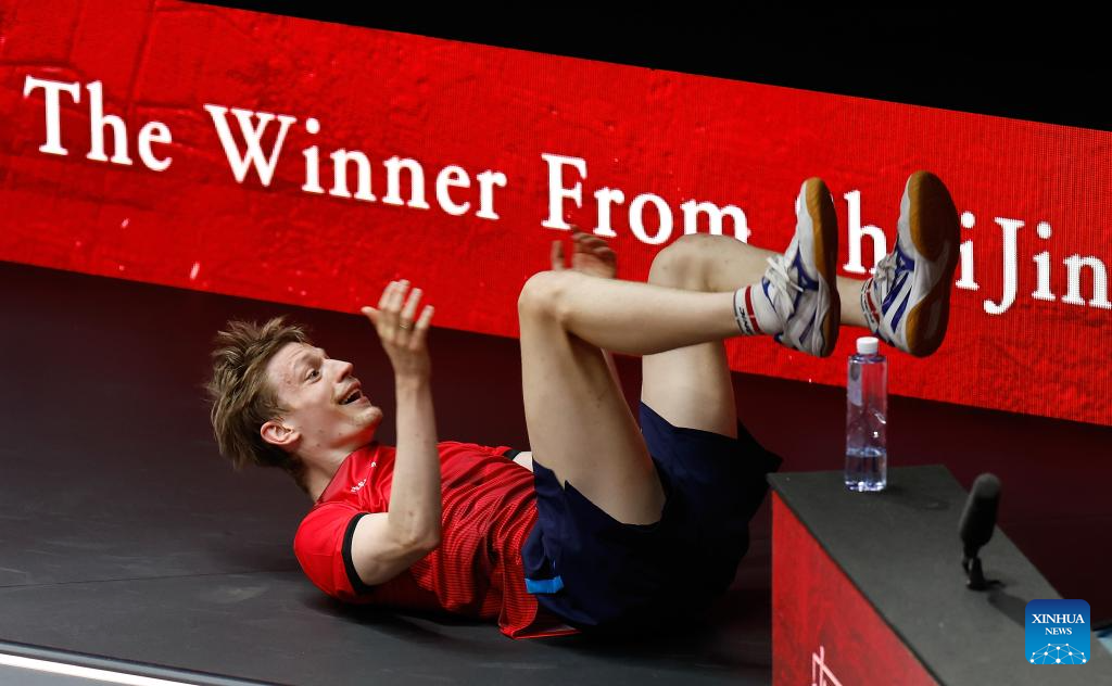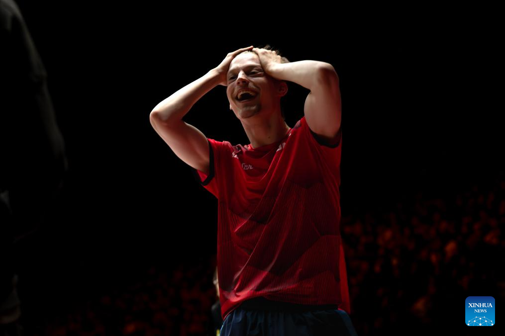 Anders Lind of Denmark celebrates after winning the men's singles round of 32 match against Wang Chuqin of China at 2024 World Table Tennis (WTT) China Smash in Beijing, China, Oct. 1, 2024. (Xinhua/Wang Lili)