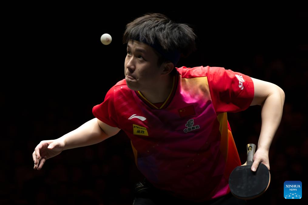 Wang Chuqin of China serves during the men's singles round of 32 match against Anders Lind of Denmark at 2024 World Table Tennis (WTT) China Smash in Beijing, China, Oct. 1, 2024. (Xinhua/Xiao Yijiu)