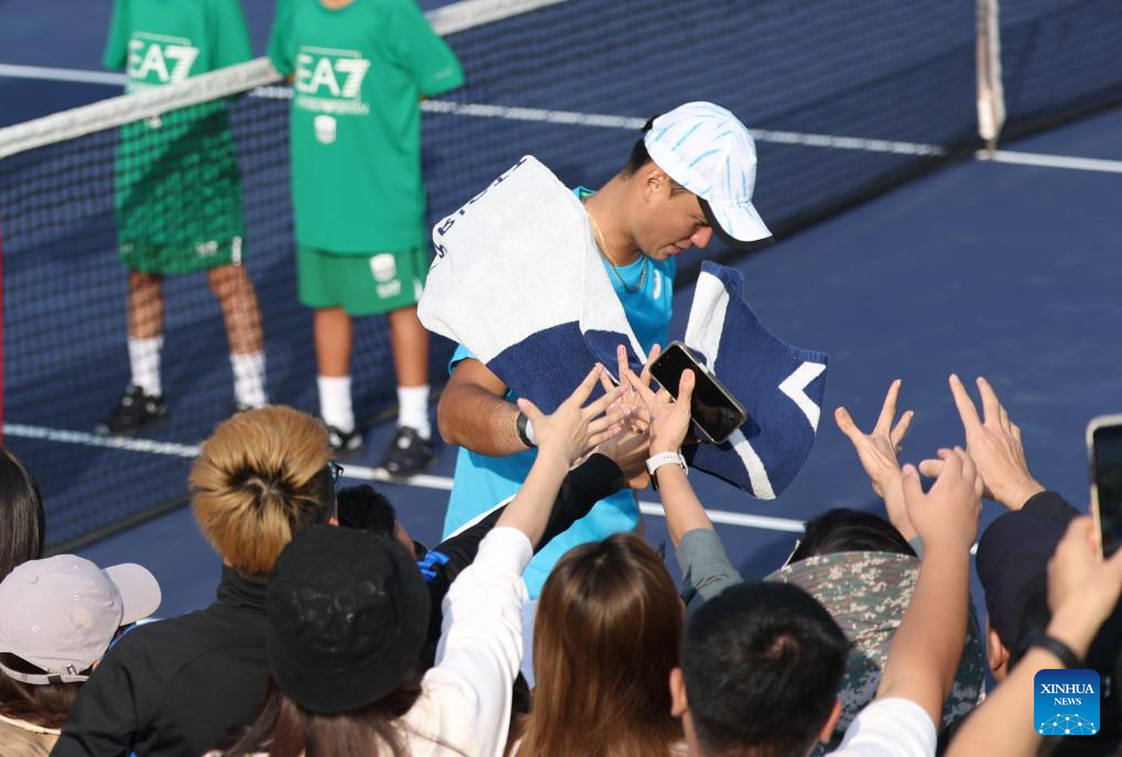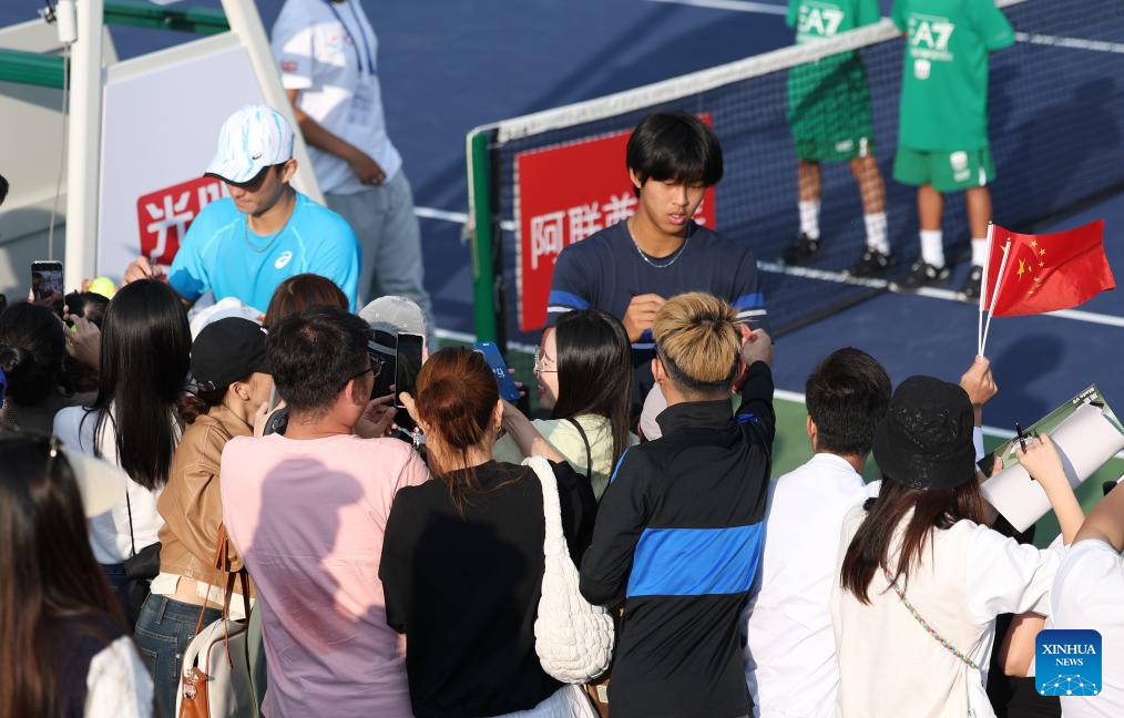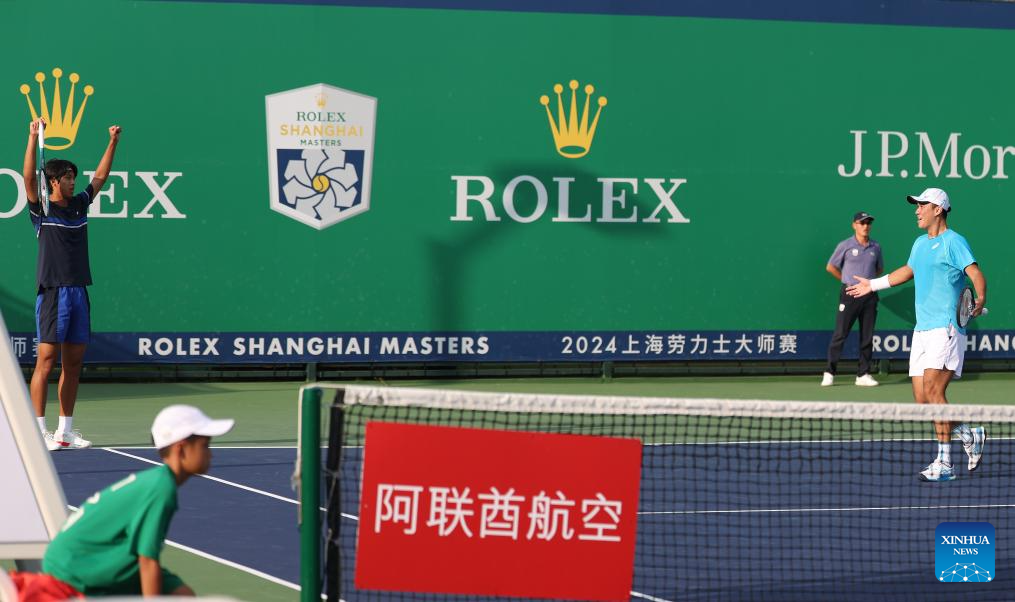 Wang Aoran interacts with fans after the men's doubles round of 32 match between Zhou Yi/Wang Aoran of China and Sadio Doumbia/Fabien Reboul of France at the ATP World Tour Shanghai Masters tennis tournament in Shanghai, east China, Oct. 8, 2024. (Xinhua/Bai Xuefei)