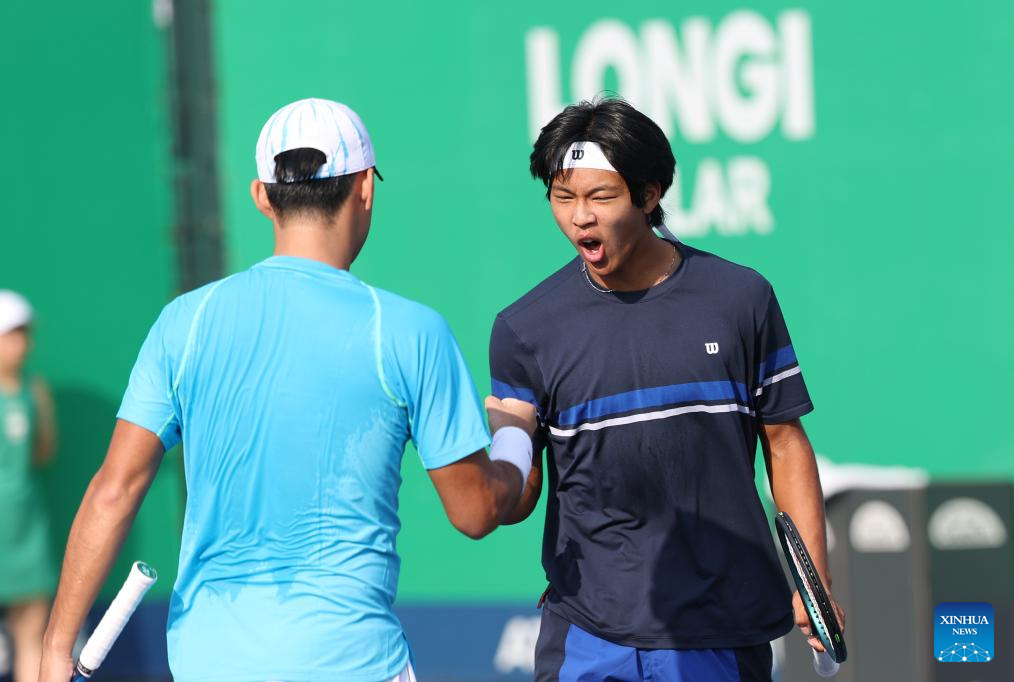 Wang Aoran and Zhou Yi (L) celebrate after the men's doubles round of 32 match between Zhou Yi/Wang Aoran of China and Sadio Doumbia/Fabien Reboul of France at the ATP World Tour Shanghai Masters tennis tournament in Shanghai, east China, Oct. 8, 2024. (Xinhua/Bai Xuefei)