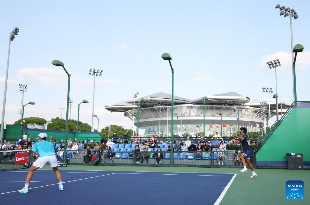 Wang Aoran and Zhou Yi (R) sign for fans after the men's doubles round of 32 match between Zhou Yi/Wang Aoran of China and Sadio Doumbia/Fabien Reboul of France at the ATP World Tour Shanghai Masters tennis tournament in Shanghai, east China, Oct. 8, 2024. (Xinhua/Bai Xuefei)