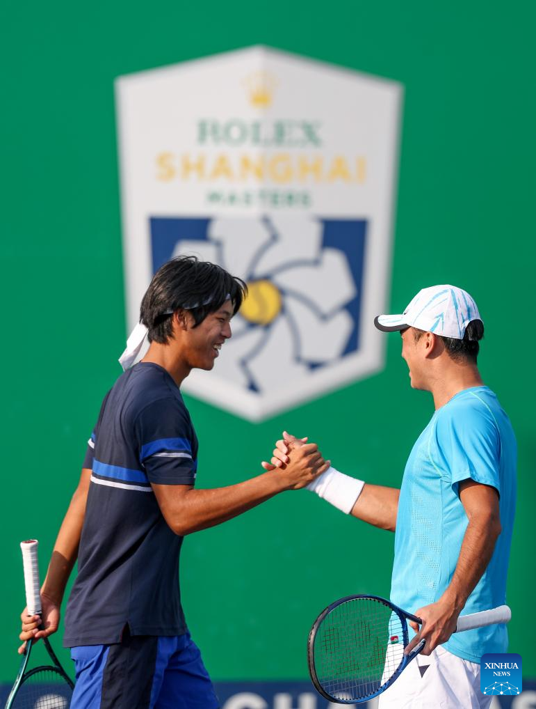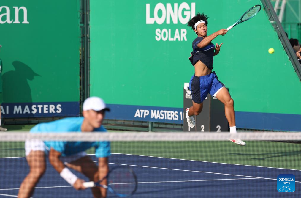 Wang Aoran and Zhou Yi (R) compete during the men's doubles round of 32 match between Zhou Yi/Wang Aoran of China and Sadio Doumbia/Fabien Reboul of France at the ATP World Tour Shanghai Masters tennis tournament in Shanghai, east China, Oct. 8, 2024. (Xinhua/Bai Xuefei)