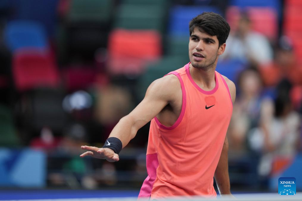 Carlos Alcaraz reacts during the men's singles round of 16 match between Carlos Alcaraz of Spain and Gael Monfils of France at the ATP World Tour Shanghai Masters tennis tournament in Shanghai, east China, Oct. 9, 2024. (Xinhua/Xu Yanan)
