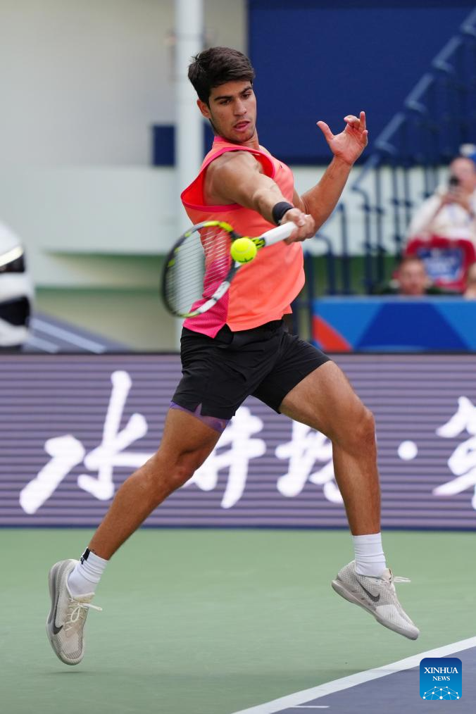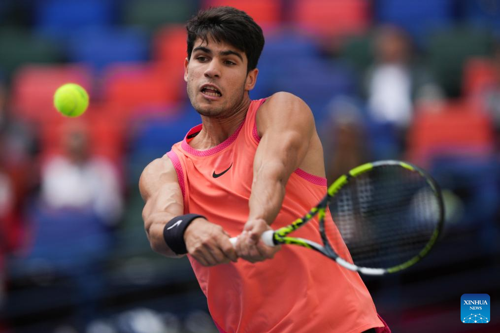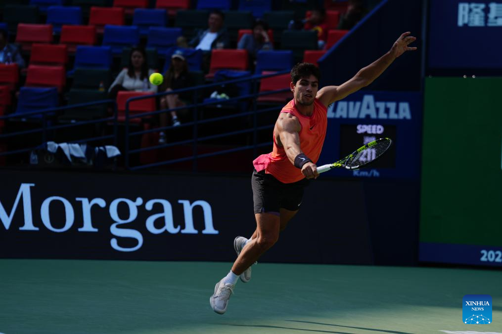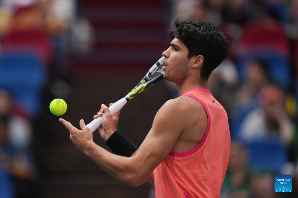 Carlos Alcaraz hits a return during the men's singles round of 16 match between Carlos Alcaraz of Spain and Gael Monfils of France at the ATP World Tour Shanghai Masters tennis tournament in Shanghai, east China, Oct. 9, 2024. (Xinhua/Xu Yanan)
