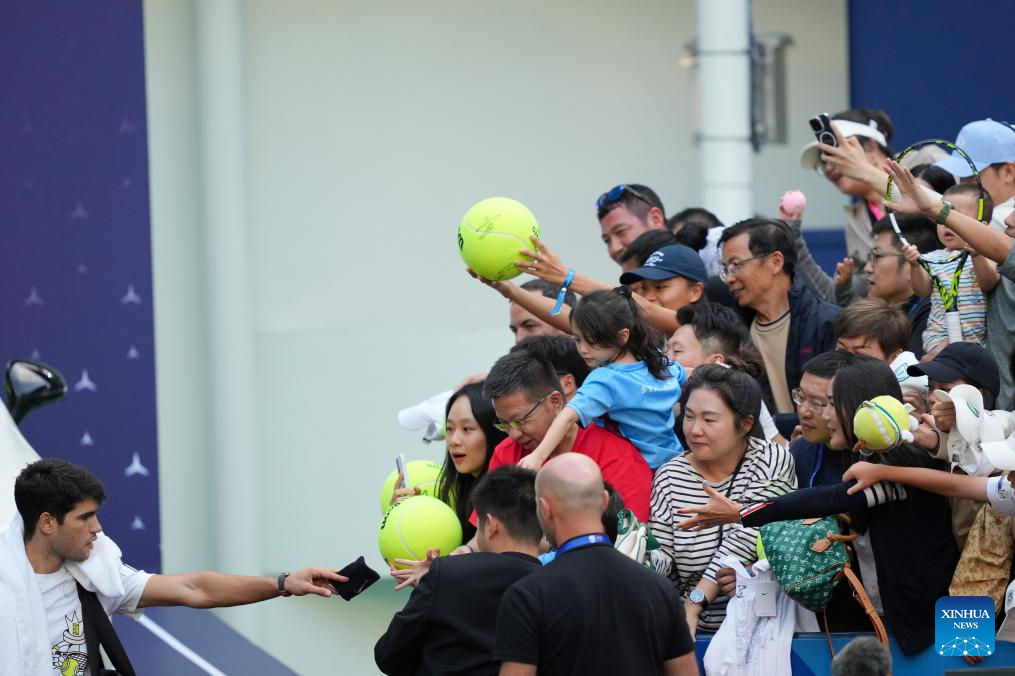 Carlos Alcaraz passes his wrist band after winning the men's singles round of 16 match between Carlos Alcaraz of Spain and Gael Monfils of France at the ATP World Tour Shanghai Masters tennis tournament in Shanghai, east China, Oct. 9, 2024. (Xinhua/Xu Yanan)