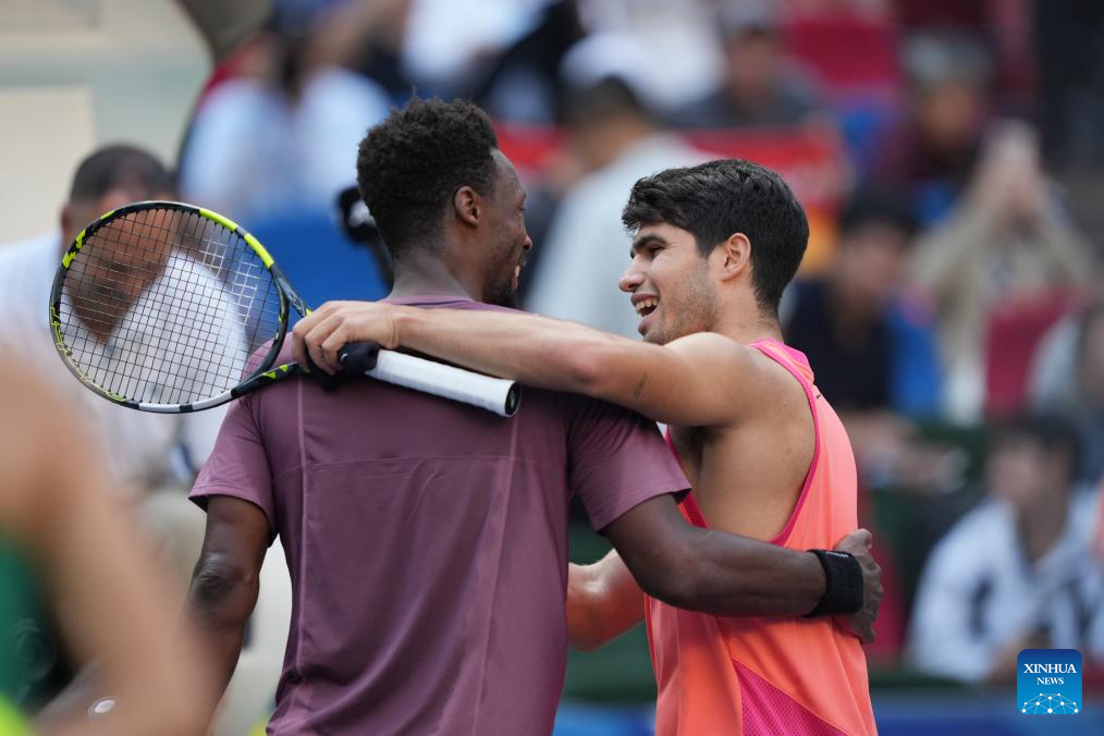 Carlos Alcaraz (R) and Gael Monfils greet each other after the men's singles round of 16 match between Carlos Alcaraz of Spain and Gael Monfils of France at the ATP World Tour Shanghai Masters tennis tournament in Shanghai, east China, Oct. 9, 2024. (Xinhua/Xu Yanan)
