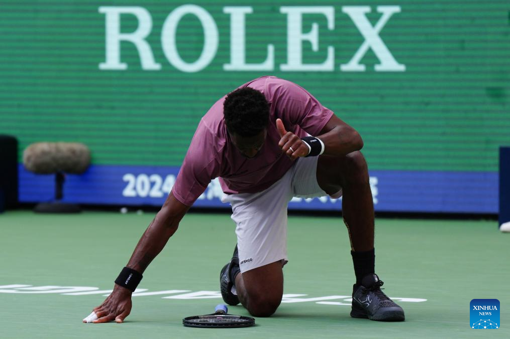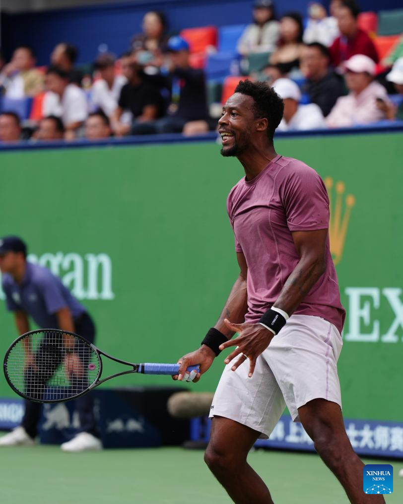 Gael Monfils reacts during the men's singles round of 16 match between Carlos Alcaraz of Spain and Gael Monfils of France at the ATP World Tour Shanghai Masters tennis tournament in Shanghai, east China, Oct. 9, 2024. (Xinhua/Xu Yanan)