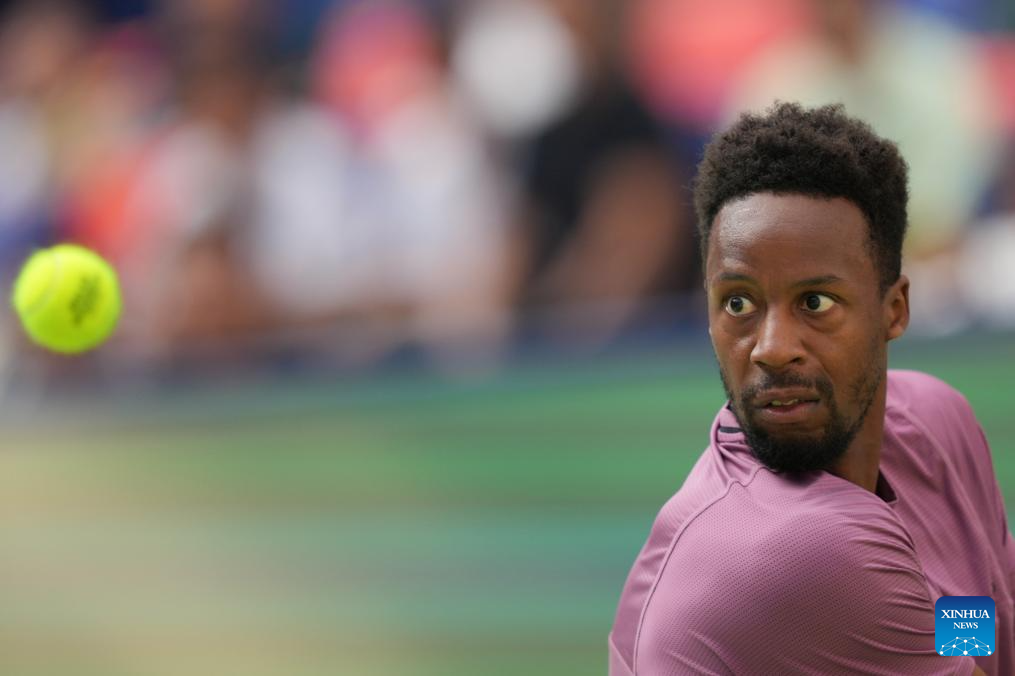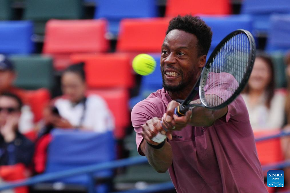 Gael Monfils hits a return during the men's singles round of 16 match between Carlos Alcaraz of Spain and Gael Monfils of France at the ATP World Tour Shanghai Masters tennis tournament in Shanghai, east China, Oct. 9, 2024. (Xinhua/Xu Yanan)