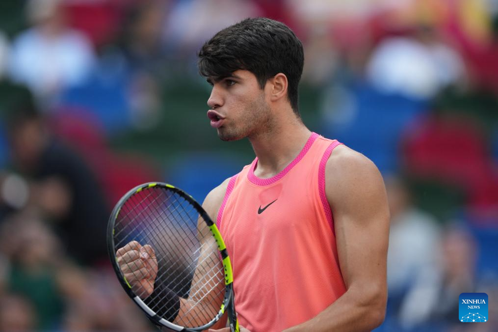 Carlos Alcaraz celebrates during the men's singles round of 16 match between Carlos Alcaraz of Spain and Gael Monfils of France at the ATP World Tour Shanghai Masters tennis tournament in Shanghai, east China, Oct. 9, 2024. (Xinhua/Xu Yanan)