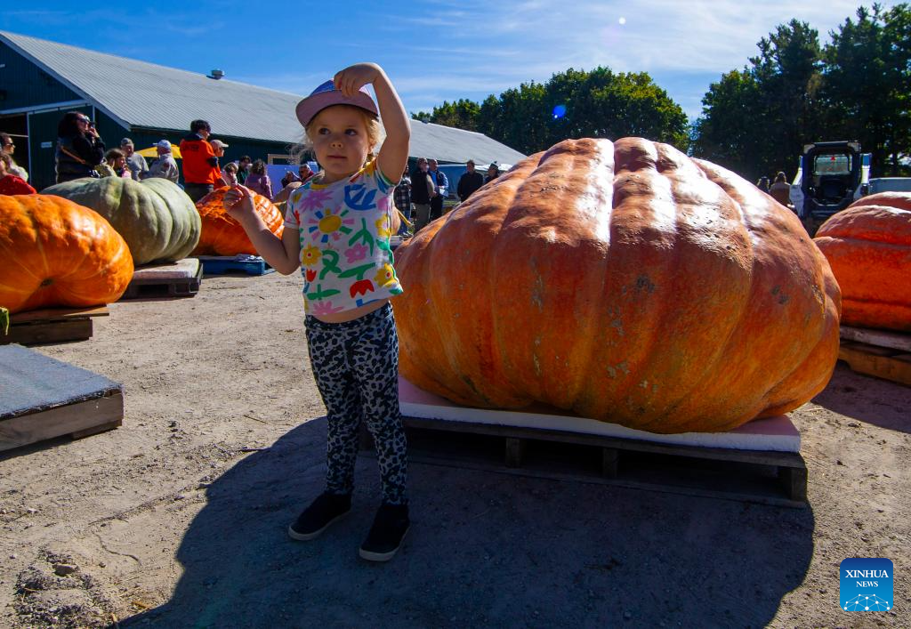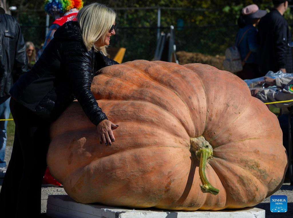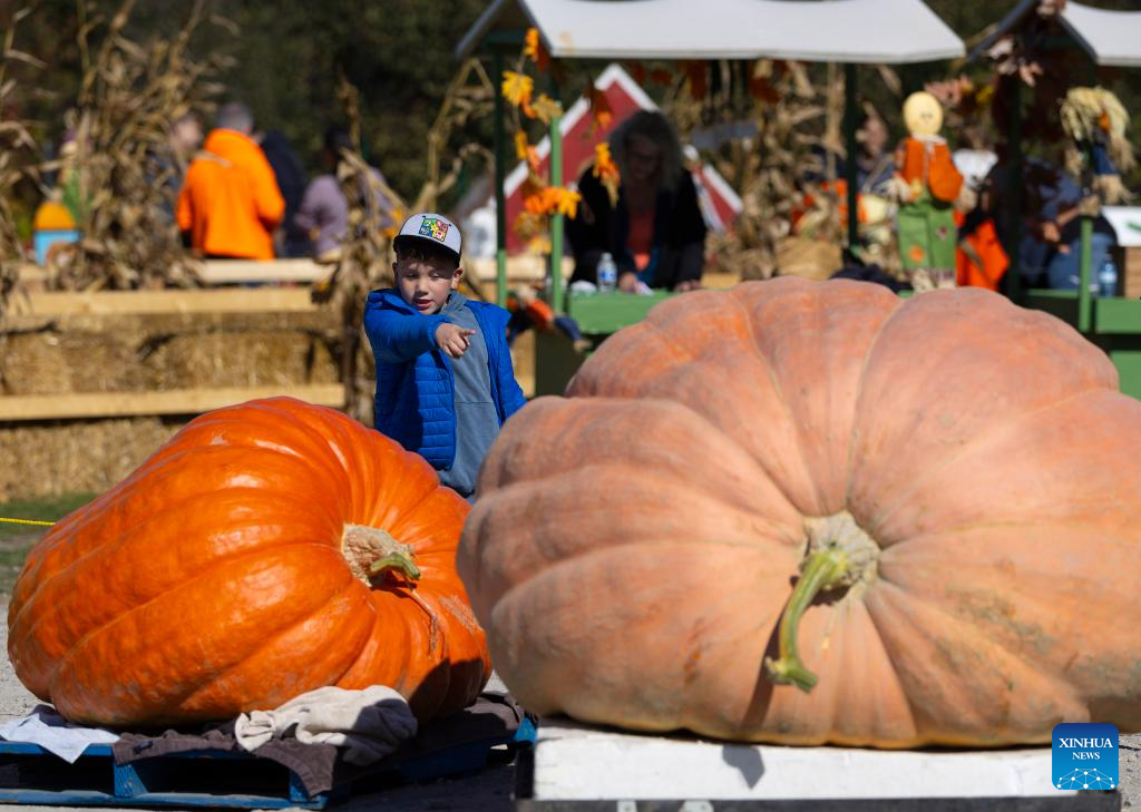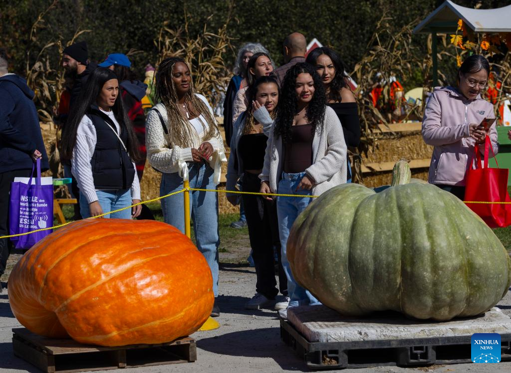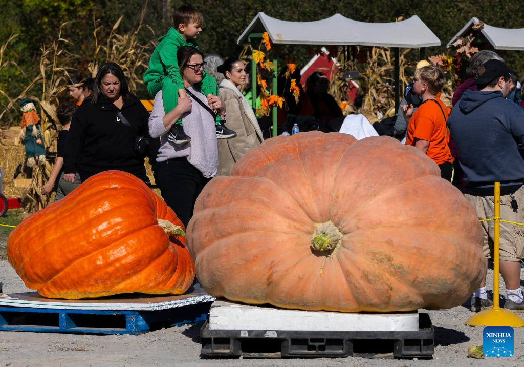 People visit a giant pumpkin contest at the Woodbridge Fall Fair in Woodbridge, Ontario, Canada, on Oct. 12, 2024. (Photo by Zou Zheng/Xinhua)