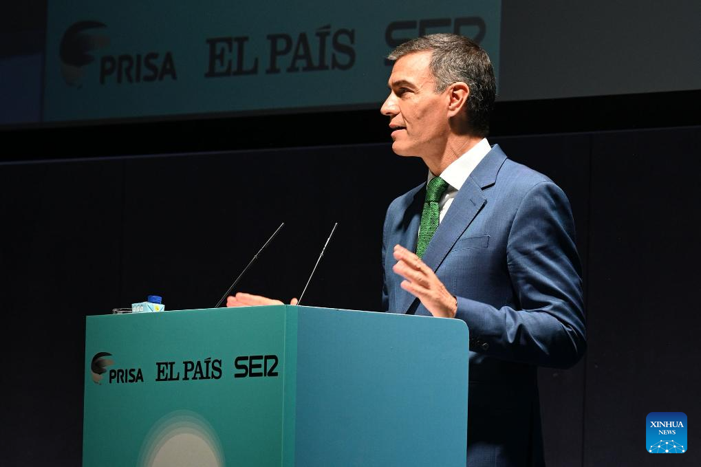 Spanish Prime Minister Pedro Sanchez speaks at an event in Barcelona, Spain, on Oct. 14, 2024. Sanchez said here on Monday that the United Nations Interim Force in Lebanon (UNIFIL) would remain in southern Lebanon. He also called on the international community to maintain its support for the UN, and immediately suspend arms shipments to Israel "as Spain has already done." Israeli Prime Minister Benjamin Netanyahu on Sunday urged the United Nations to withdraw its UNIFIL peacekeeping force from southern Lebanon. (La Moncloa/Handout via Xinhua)