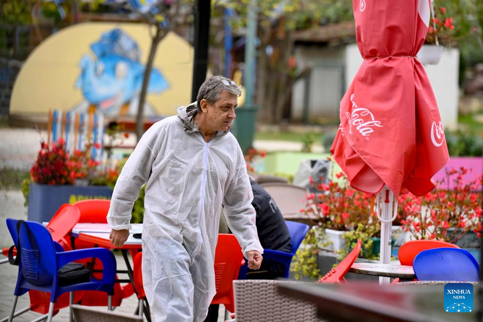 A staff member in protective suit walks inside the closed Skopje Zoo in Skopje, Republic of North Macedonia, Oct. 19, 2024. The main zoo in Skopje, the capital of North Macedonia, was closed on Saturday following the confirmation of an H5N1 bird flu case, according to the Food and Veterinary Agency. As a precaution, the zoo will remain closed for 21 days. (Photo by Tomislav Georgiev/Xinhua)
