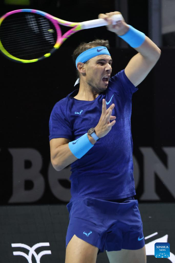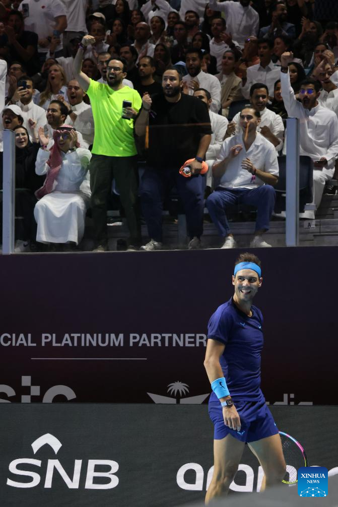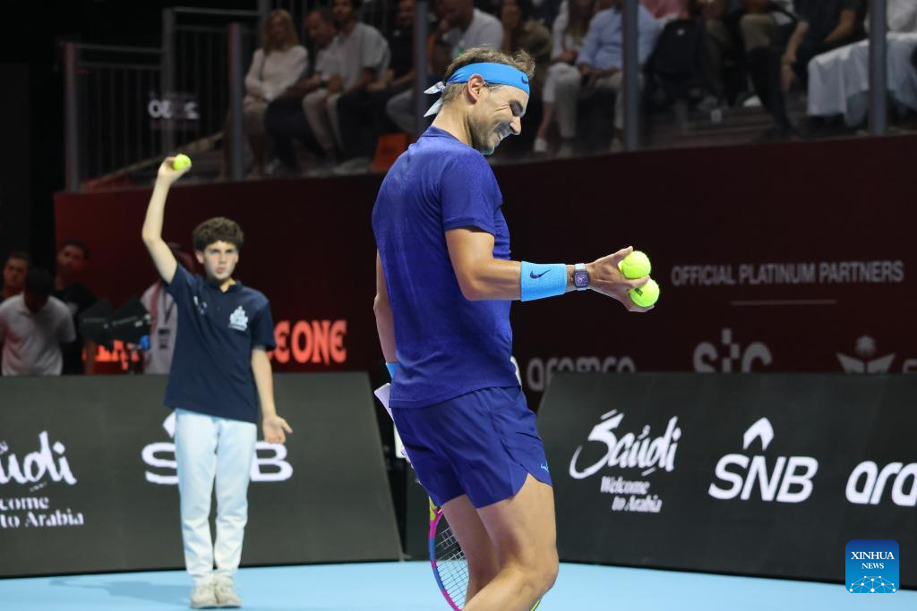 Rafael Nadal of Spain competes during the third-place match against Novak Djokovic of Serbia at Saudi Arabia's "6 Kings Slam" exhibition tennis tournament in Riyadh, Saudi Arabia, Oct. 19, 2024. (Xinhua/Luo Chen)